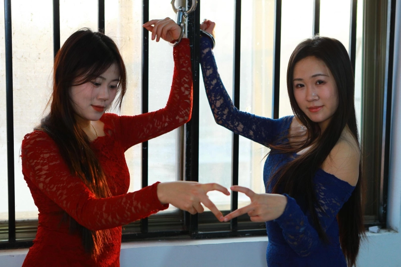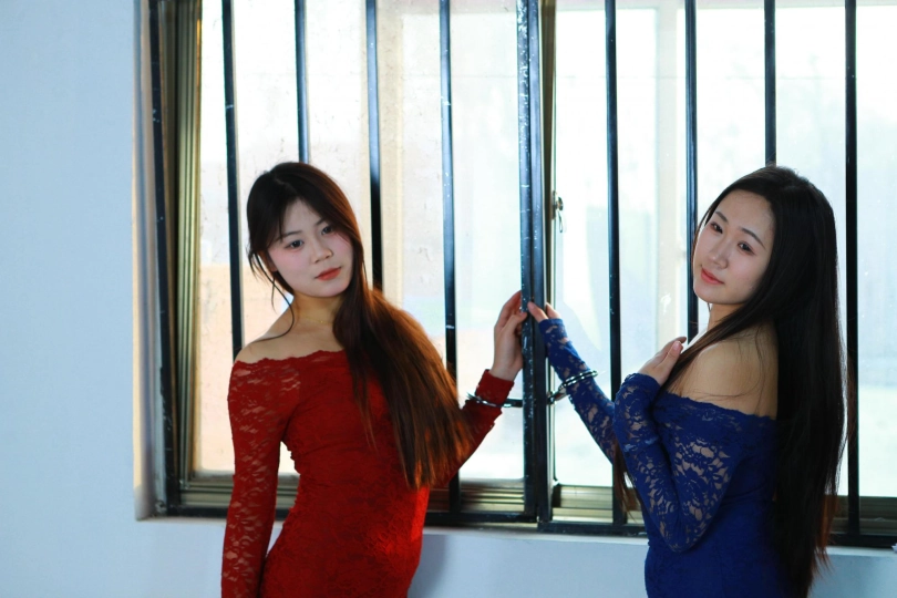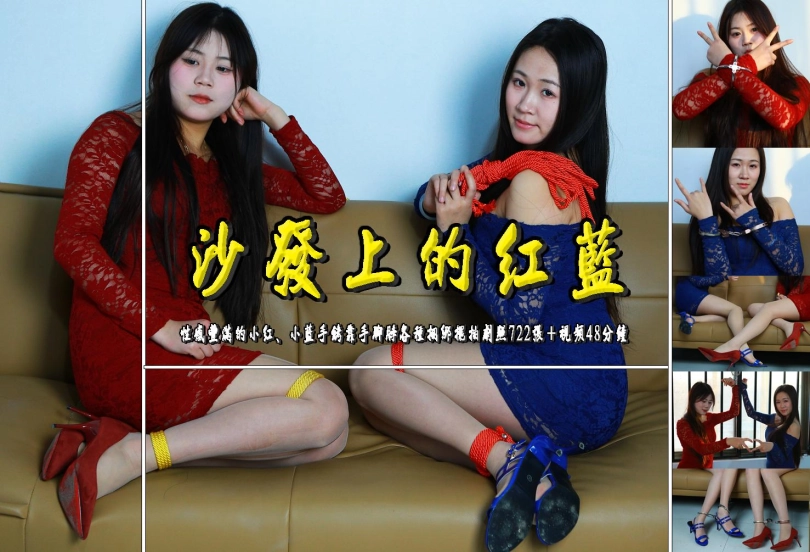 [One Rope Is With You] [Red and Blue on the Sofa] Sexy and plump Xiao Hong and Xiao Lan pose for photos with their hands, feet and neck tied in various ways with handcuffs |