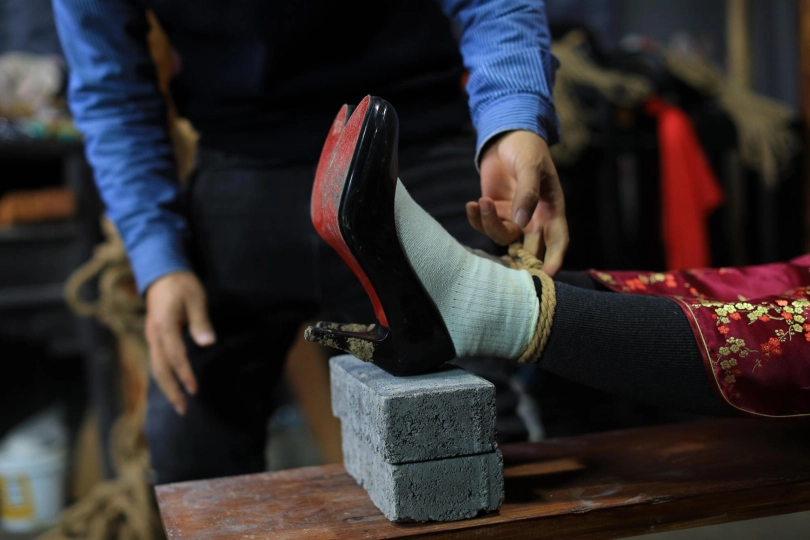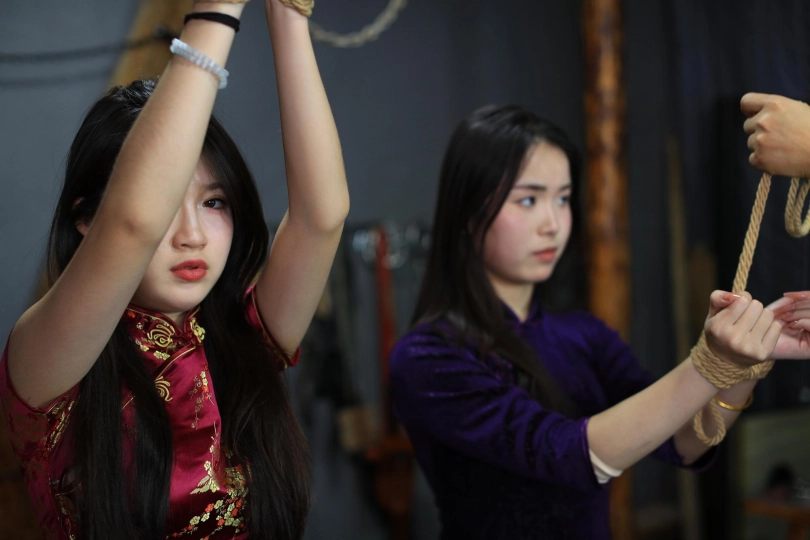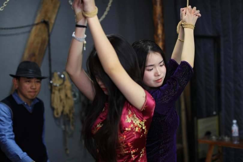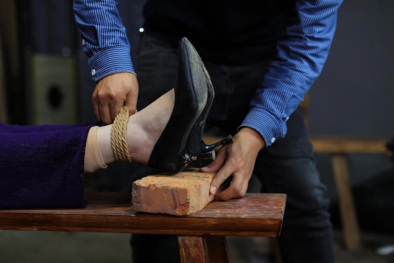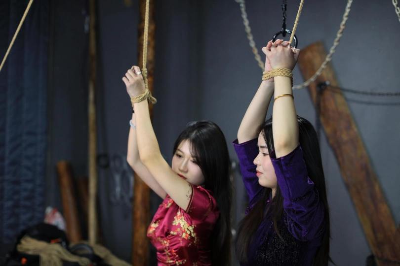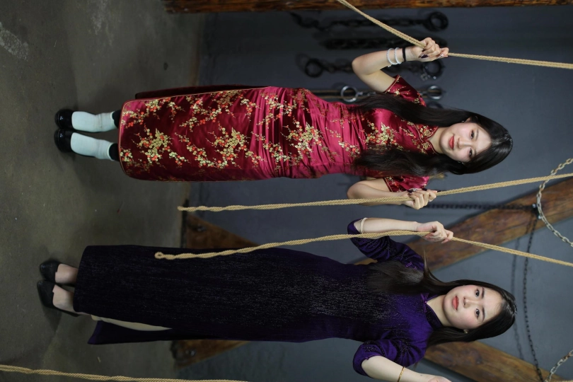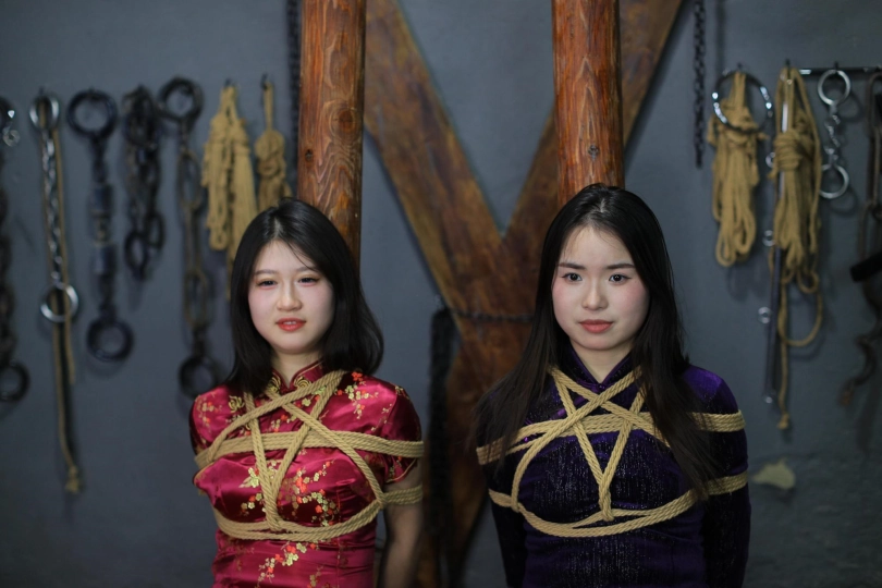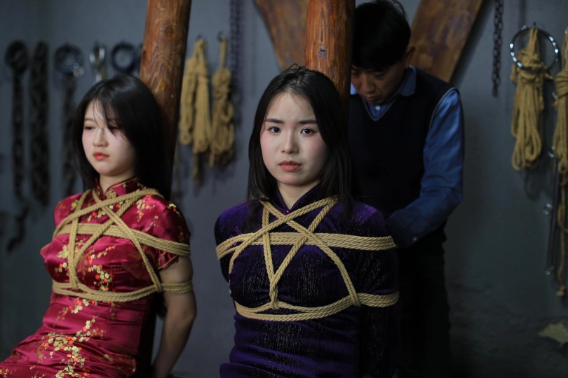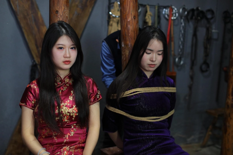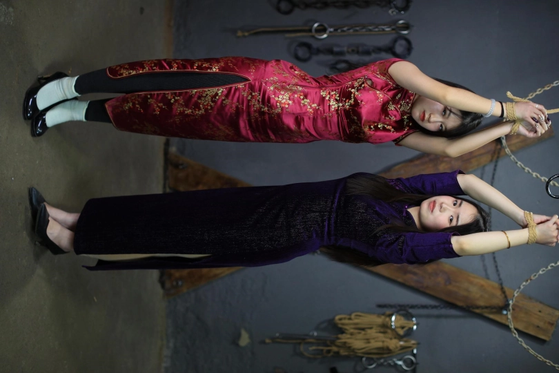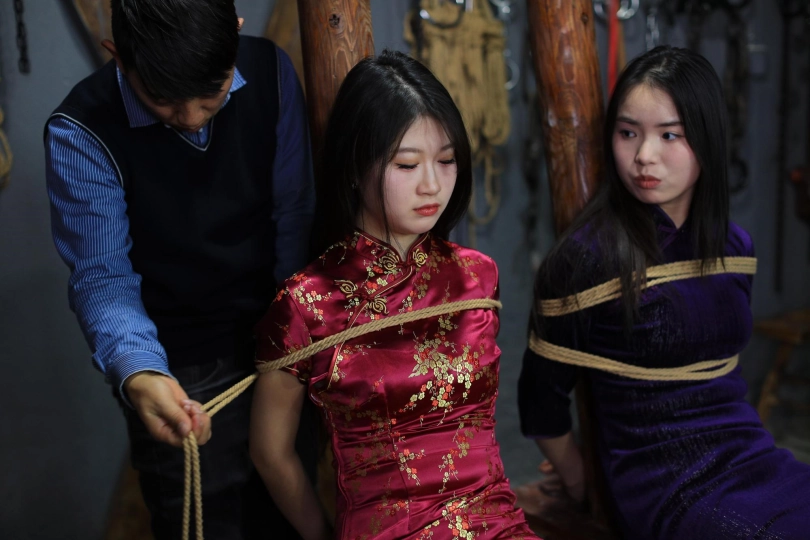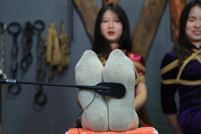 [One Rope Is With You] [Cheongsam Girl on the Tiger Bench] The beautiful girl Su Ling and Liu Yan were tied up with both hands and hung up on the Tiger Bench, taking off her shoes and beating her feet. |